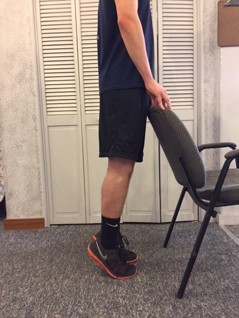 PHOTO 1a & 1b: Eccentric Lowering and Lengthening: for the Achilles tendon during exercise. Beginning on the ball of both feet (1a), bend the strong knee to shift the weight onto the weak leg (1b). Slowly lowering the ankle/heel to the ground over 5-6 seconds. Repeat.