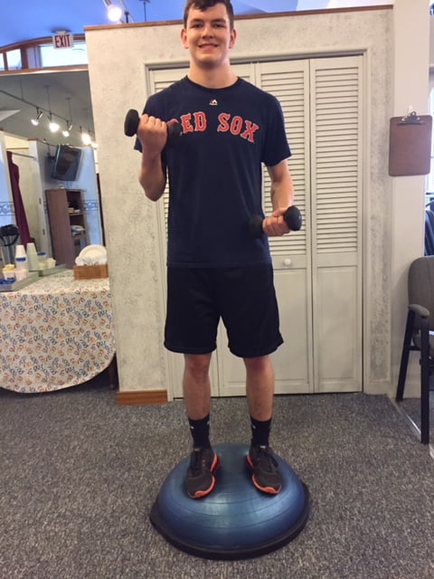 PHOTO 2: Proprioceptive Training: for the Achillies tendon. Standing on a Bosu Ball while exercising the upper body (for example, biceps curls, shrugs, rows, lats) while maintaining balance on the ball.