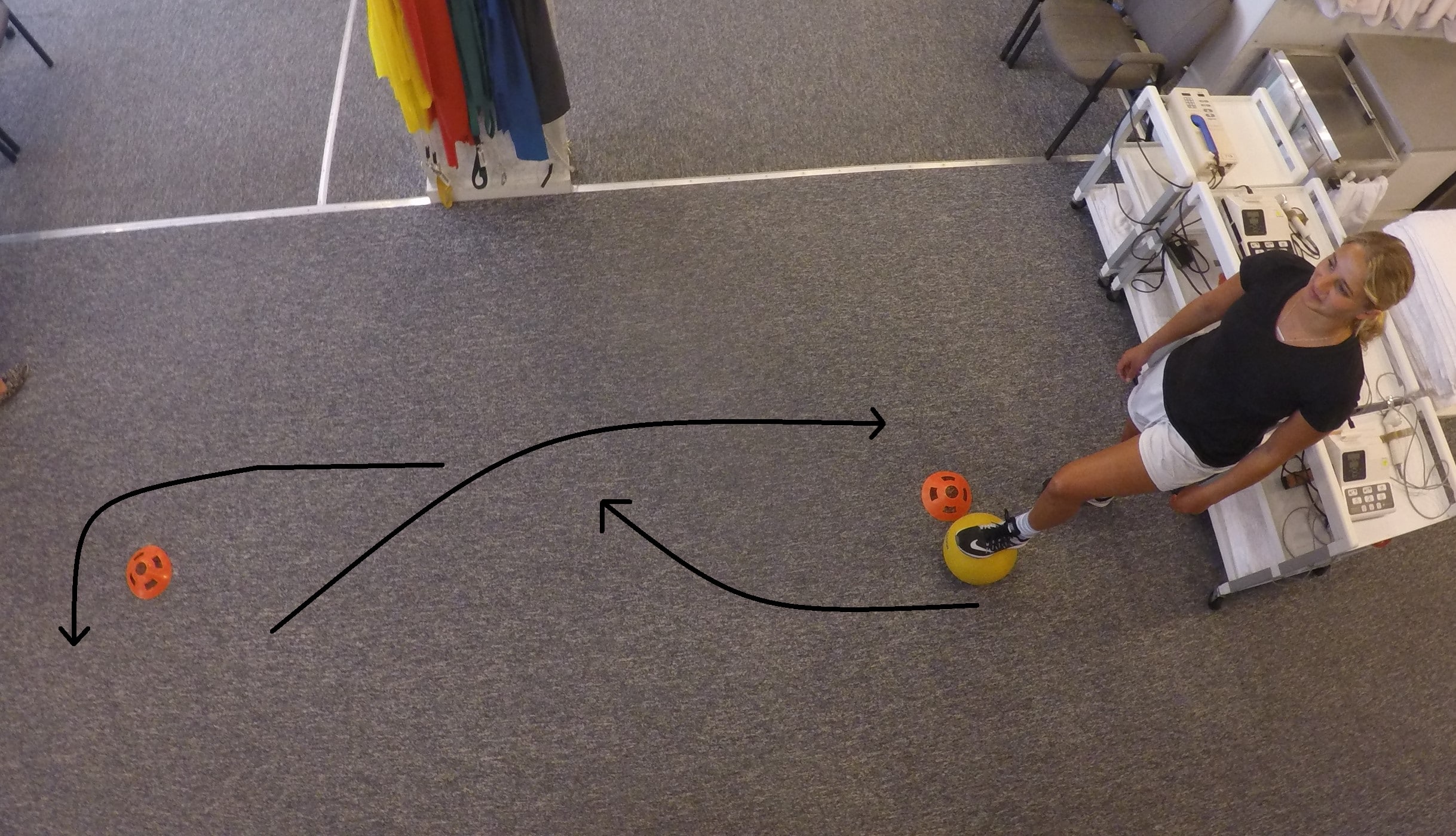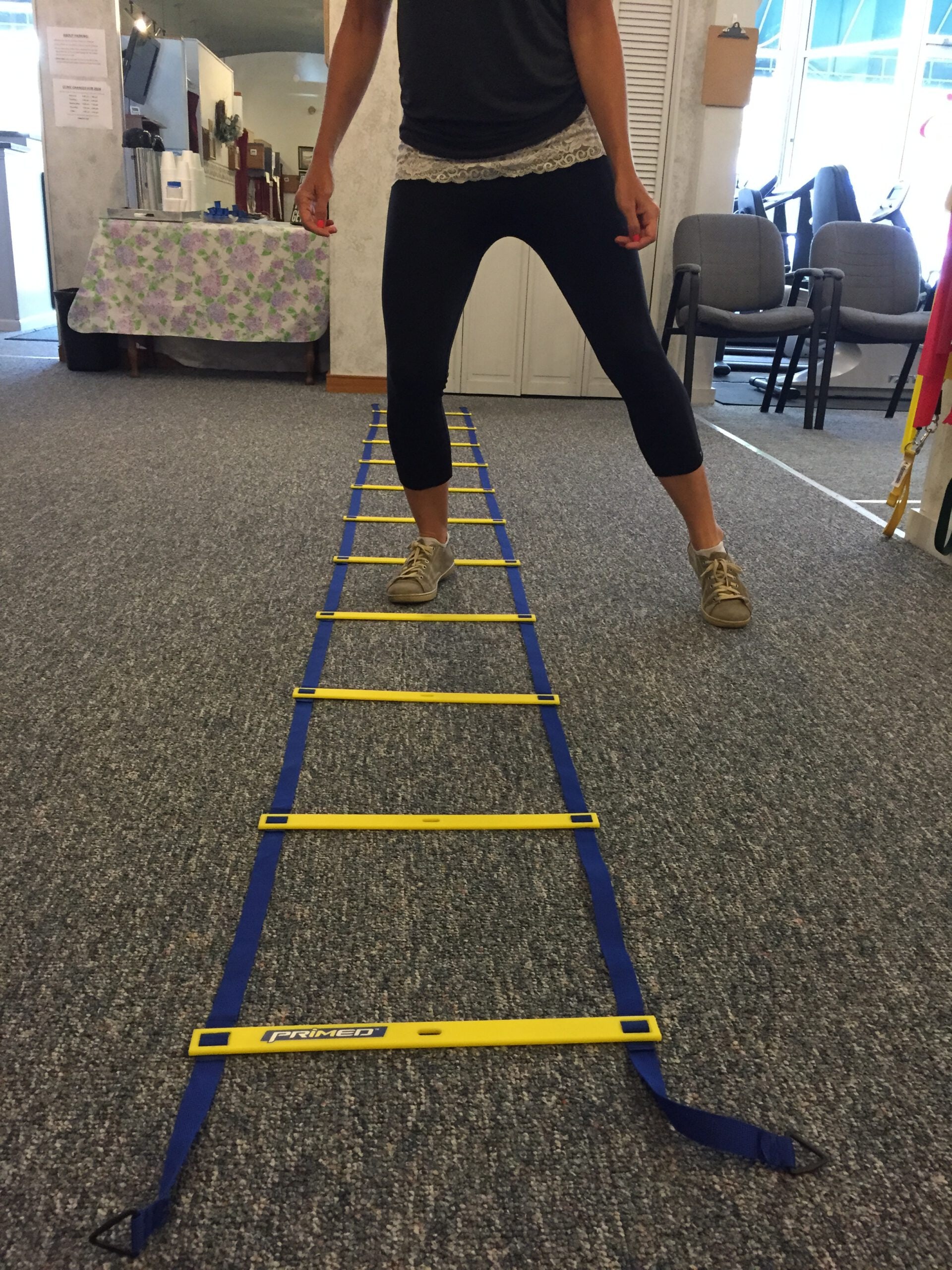 As in Weeks 1 and 2, start with one lap around the field, followed by the dynamic warm up and hops. New to Weeks 3 and 4 are agility exercises. Agility exercises can be modified to be sport specific. With the intent of increasing balance and strength for the athletes, proper body positioning and landing techniques are important here. A good sport specific agility exercise is Figure 8’s (Photo 13—Figure 8’s), or use of an agility ladder (Photo 14).