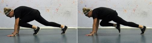 Examples of advanced plyometric exercises include: Jump squats (Photo 15), knee-to-chest (Photo 16), single leg lateral hops (Photo 17), and mountain climbers (Photo 18). These exercises should be done for 10 yards, then athletes should accelerate for another 10 yards.