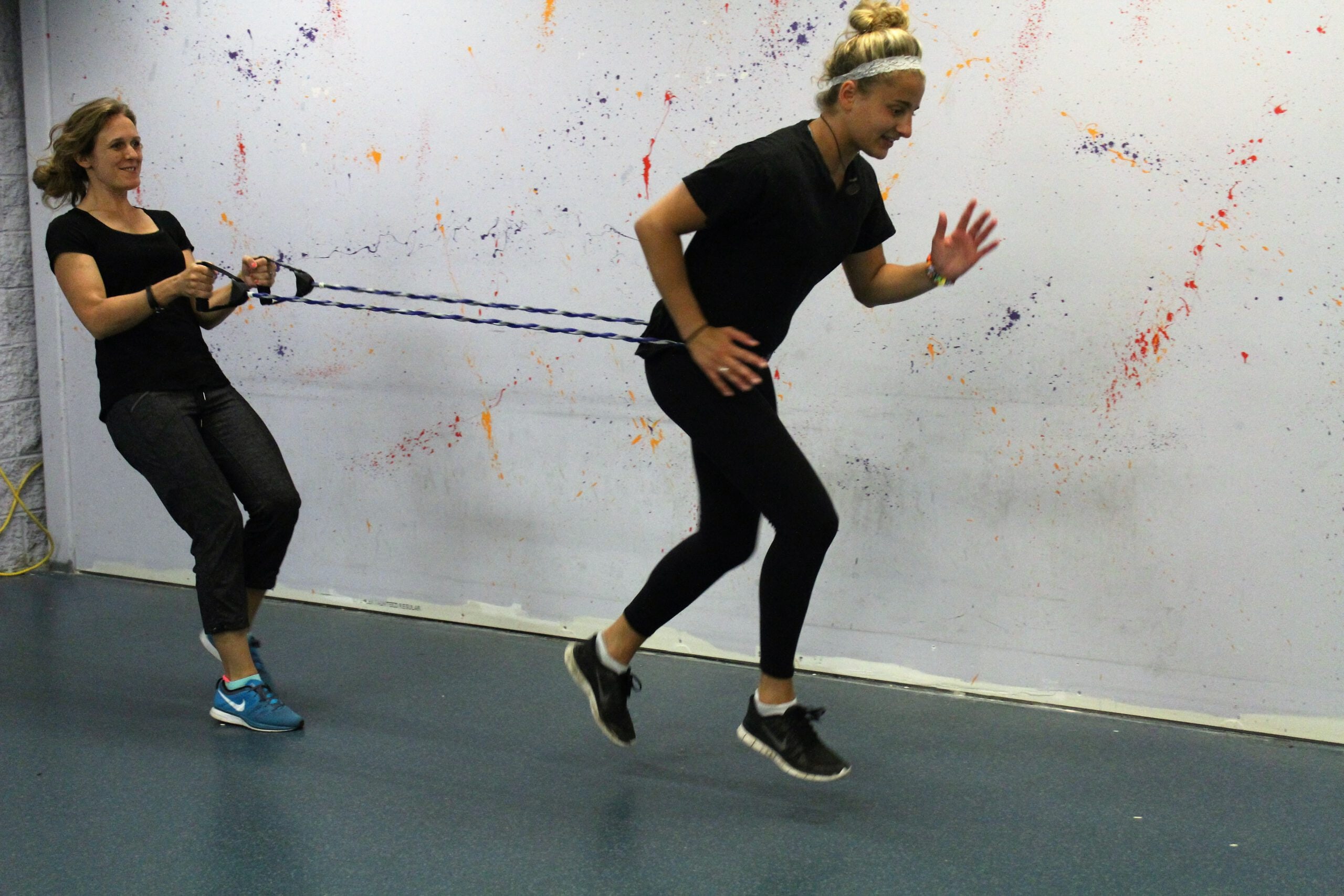 A great resistance exercise is sports cord with a partner (Photo 19). By having one athlete running forward while attached to a band, and another athlete holding it behind them, both athletes are working on improving strength and balance.