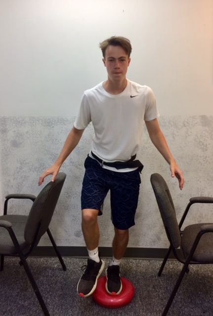 Exercise 3: Single Leg Stance on Stability Disc (Photo 2): The next variation of the single leg stance exercise involves a rubber disc that is inflated with air. These exercise balance stability discs can be found on Amazon for as little as $12. Like the pillow/foam exercise, the disc is placed under the foot but this time the goal is to stand on the disc for five seconds at a time, repeating it five times. Once a single leg stance on a stability disc can be held for up to 15 seconds 5 times in a row with ease and no pain, progress to exercise 4.
