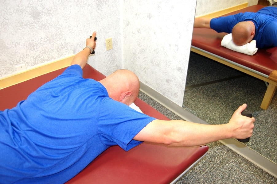 PHOTO B: “T’s”: Lying Face Down with Forehead on Towel Roll and With Light Dumbbell Weight in Hands, Raise Arms up in the shape of a “T.”