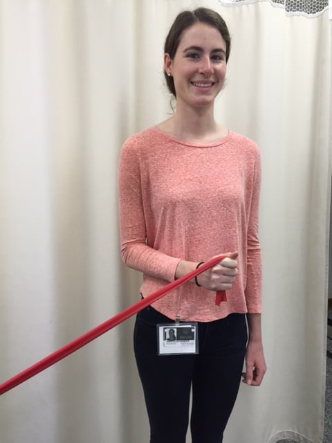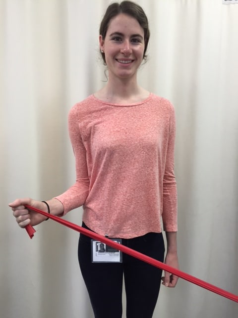 PHOTO E: Shoulder External Rotation: Stand with Exercise Band in the Throwing Hand and Elbow at the Side and Bent at 90 degrees, “Turn Out - Against the Band.”