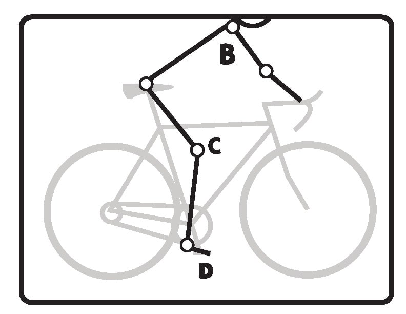The knee to pedal measurement should be taken with the knee in the most extended position. There should be about a 25-35° angle at the knee (See “C” on diagram)
