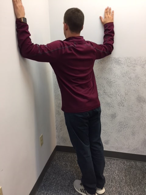 - Corner Stretch: (Photo 1) Stand facing a corner wall with arms and shoulders at 90 degrees. Lean into corner and stretch shoulders and back.