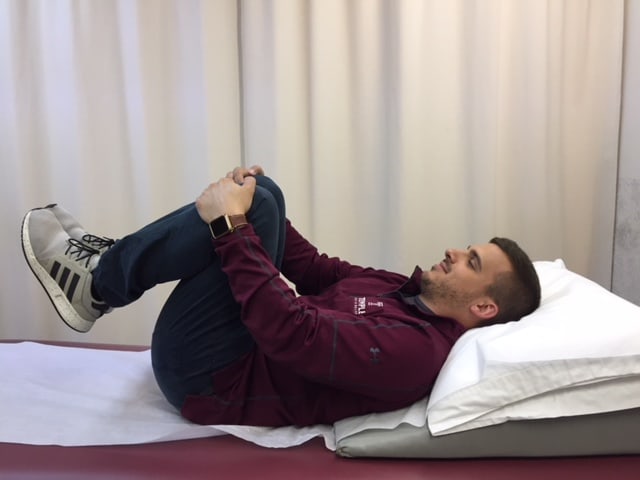 - Knees to Chest Back Stretch: (Photo 2) While lying on your back, bring both knees up towards your chest.
