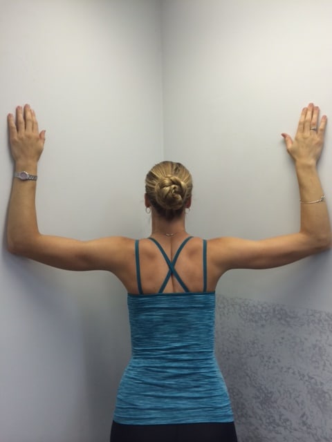 Pectoralis Stretch: Place both elbows against the frame of a door or in a corner of a room. Keep the angle between your trunk and your arm at 90 degrees. Rest your forearms against the door frame or corner wall. Lean forward to feel the stretch across your chest. Doorway Stretch (See PHOTO 2) and Corner Stretch (See PHOTO 3)