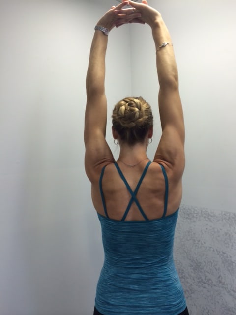 Latissimus dorsi stretch: Raise both arms overhead and place palms together interlocking fingers. At shoulders lift arms upwards with fingers remaining intertwined. (See PHOTO 7)