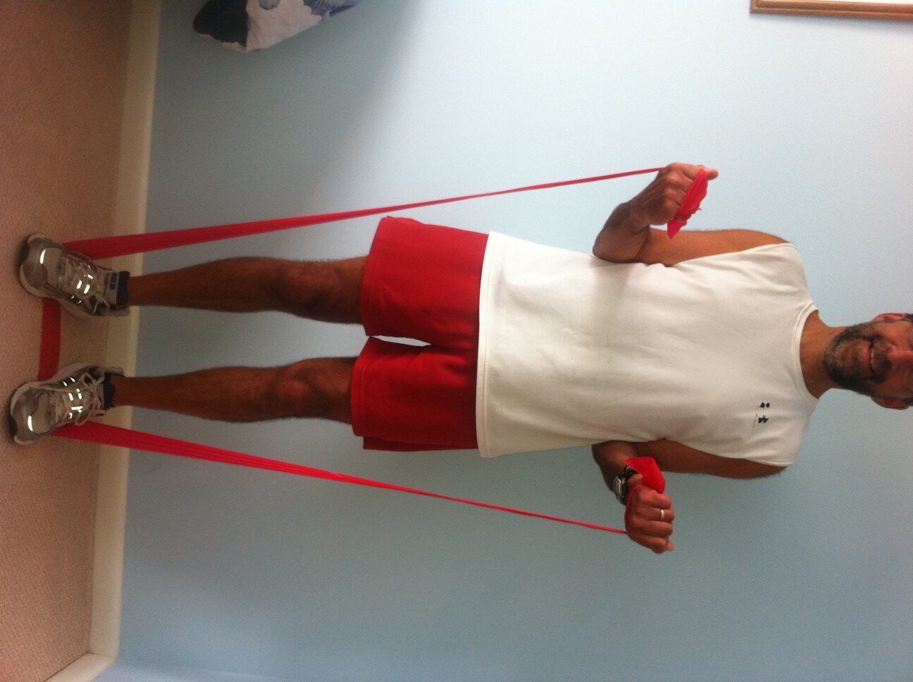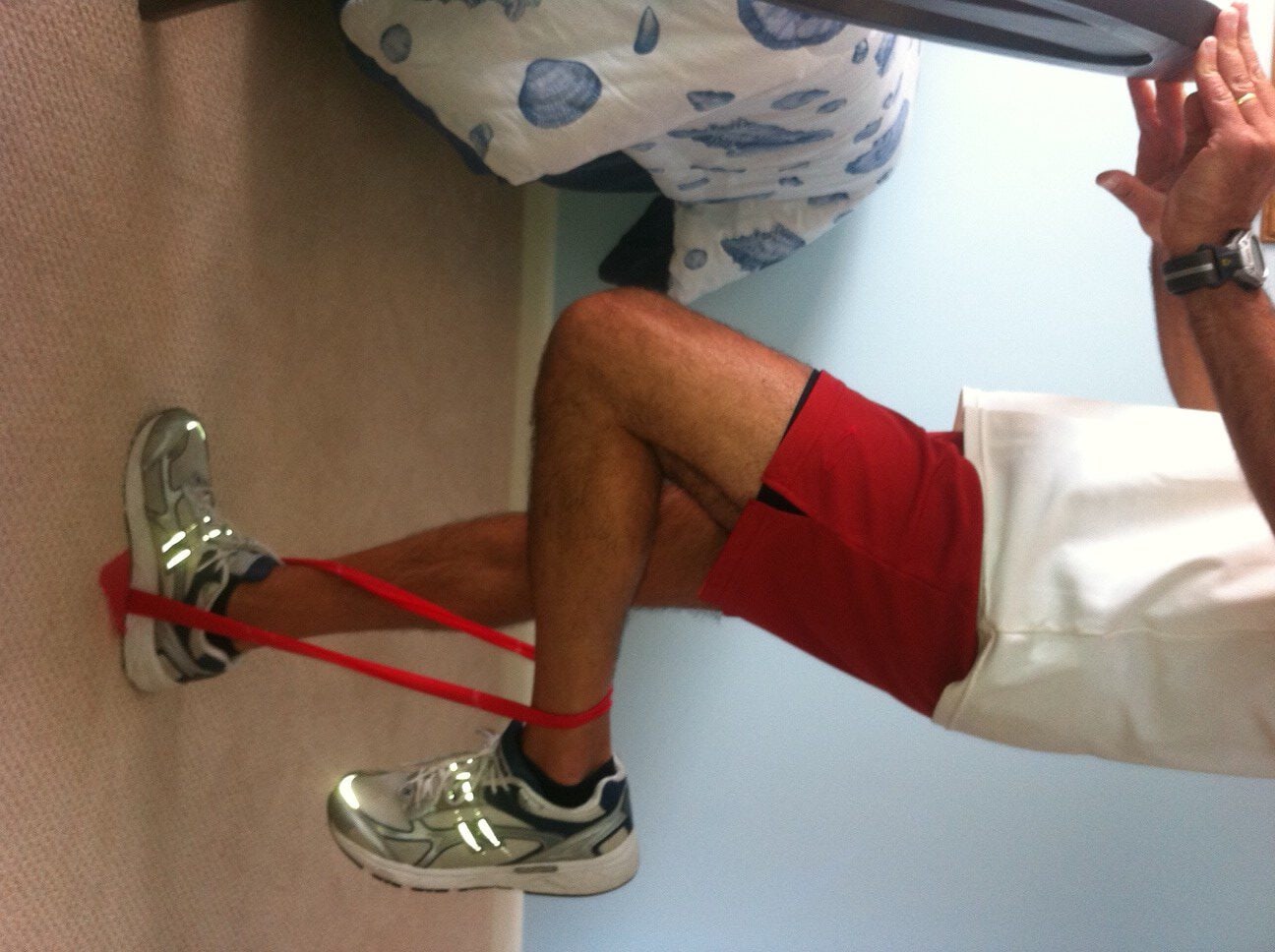 These exercises are performed while sitting in a chair with backrest, slowly and hold the position for 3 seconds, 5 -10 repetitions, and 3-5 times per week. Begin with a yellow light resistance band.