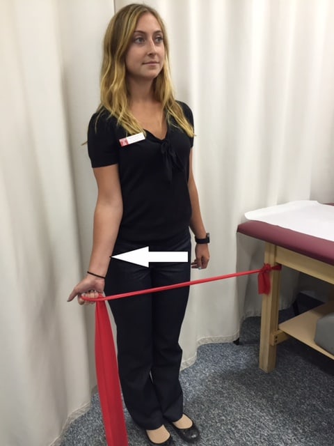 To perform these exercises, tie a resistance band to a post or a door knob, at waist level. Begin using the lowest tension band (yellow). Please note, however, that a red resistance band is used in the photos for enhanced visibility. The exercise is to be performed slowly and repeated 5 times. After one or two weeks, the repetitions may be increased to 8 or 10 times. Also, begin with exercises A, B and C the first week or two. If no problems arise, then proceed with exercises D, E and F.