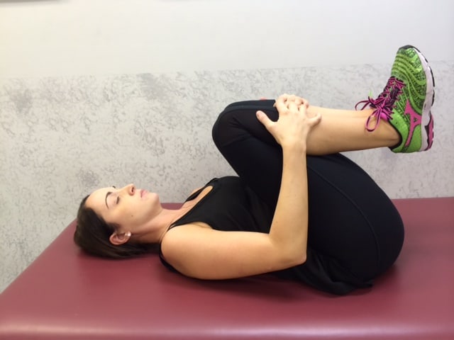 - LOW BACK FLEXION STRETCH: Lie on your back and raise your knees to your chest. Hold the knees with both your hands. Feel the stretch at the bottom of your back.