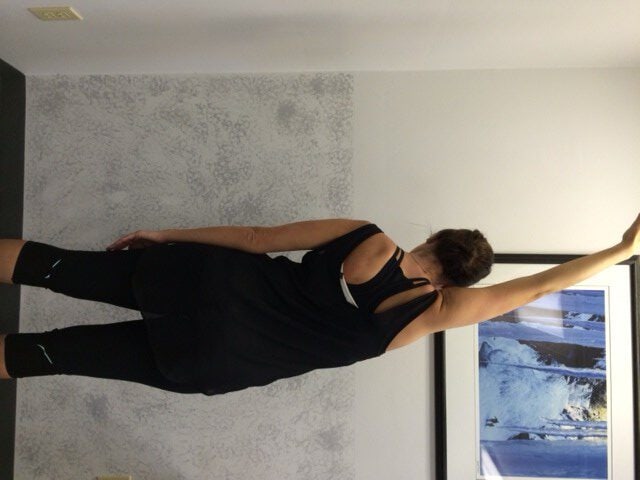 - QUAD STRETCH: Stand with your left arm holding on to a stable object for balance. Bend your right knee and bring the heel up toward your butt by pulling up/back with your right hand. Feel the stretch at the front of your right thigh. Repeat on the left