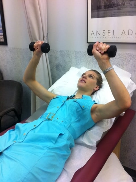 To avoid shoulder pain it is necessary to maintain shoulder strength. Stretching exercises are also important and will be discussed in next week in, Prevention of Shoulder Injuries in Tennis - Part II. Strengthening exercises need to concentrate on three groups of muscles: power muscles (the large muscles of the shoulder), shoulder blade stabilizer muscles (the muscles which stabilize the shoulder blade, and the all important rotator cuff muscles (the muscles which move the shoulder and control the cocking and follow through phases of the tennis stroke, while keeping the joint in proper position). Strengthening the power muscles of the shoulder is fairly easy; latissimus pull downs, pectoralis bench presses, and bicep curls will cover all bases. While these exercises are important in maintaining strength and power of the throwing shoulder, they are not as important as the exercises for the shoulder stabilizers and rotator cuff muscles.